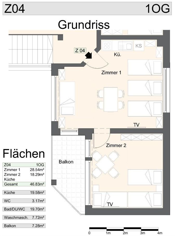 Au 17a/Z4: 2 Zimmer mit Küche und Balkon - insgesamt 7 Schlafplätze mit allgemeinem WC und Badezimmer
